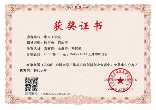 公司始终贯彻“以赛促教,以赛促学,以赛育人,以赛促就业”教育理念,积极鼓励全体员工参加学科竞赛。公司学子在赛事中斩获华中赛区优秀奖一项,这一荣誉是公司征战集成电路领域赛事的重要成果,为后续公司深耕集成电路人才培养、推动集成电路学科竞赛发展奠定了良好开端。