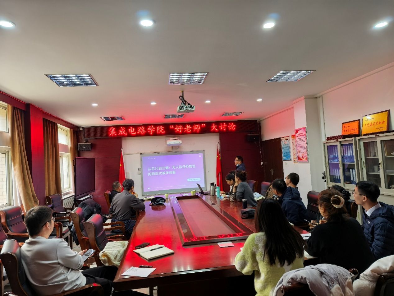 会上,六位教师代表依次结合科研与育人实践,围绕“何为好老师、如何做好老师”展开深入交流。现场气氛活跃,思想碰撞激烈。耿世勇老师以电赛为例,阐述了学科竞赛对师生能力的双重提升;徐明老师分享了在教学改革与科研创新方面的实践和思考;周谦老师以“从芯片到云端:无人机任务规划的跨层次教学创新”为题,展示了跨层次教学设计的新思路;陈天鸿、陈秋丽、侯霄楠三位老师则分别分享了各自研究领域的前沿动态及发展趋势。